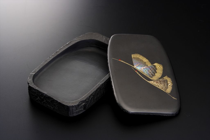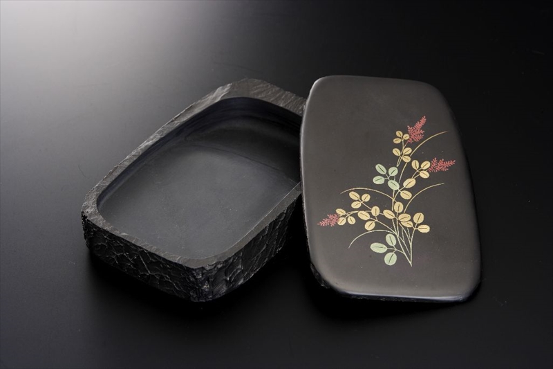一枚の石から作られる蓋に、蒔絵風の絵柄を施した硯です。